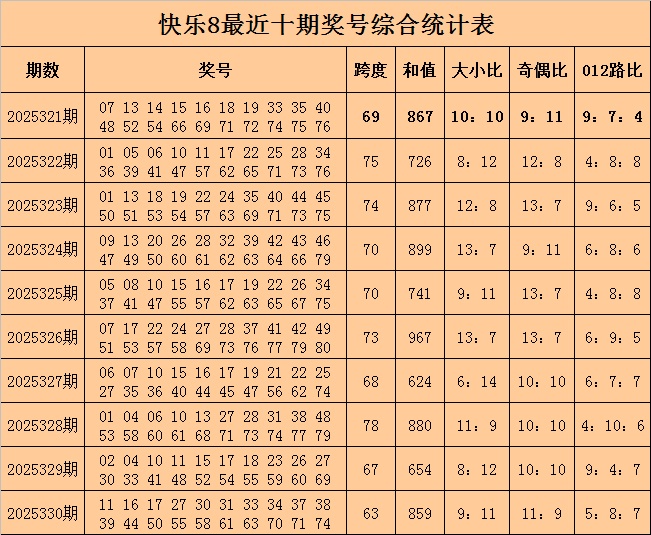 福彩爽脆8第2025330期开出奖号:11 16 17 27 30 31 33 34 37 38 39 44 50 55 58 61 63 70 71 74,其中奖号跨度开出63,和值开出859,大小比开出9:11,奇偶比开出11:9,012路比开出5:8:7。